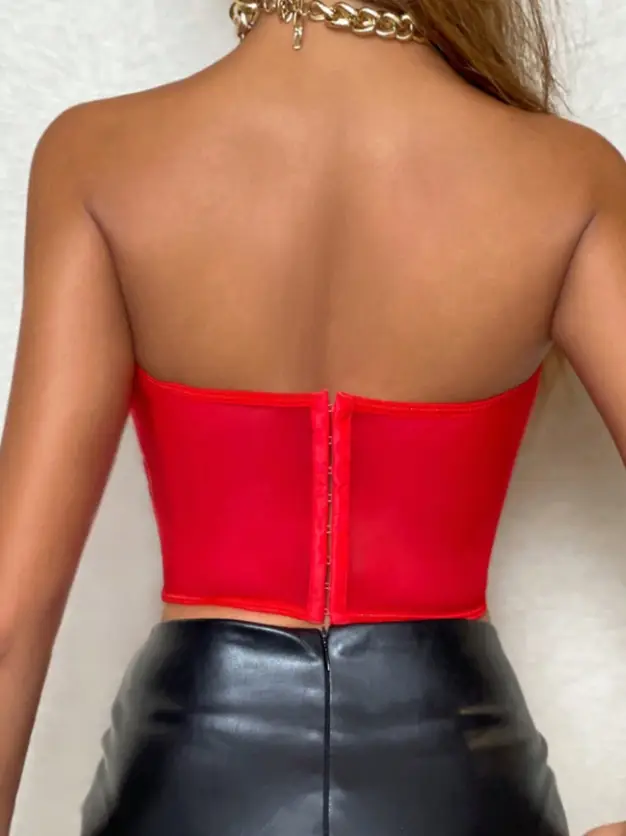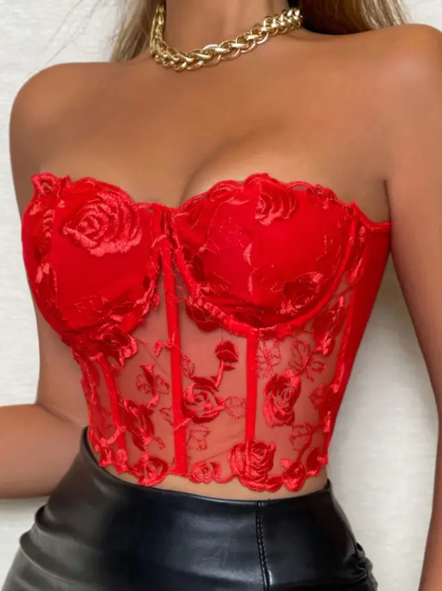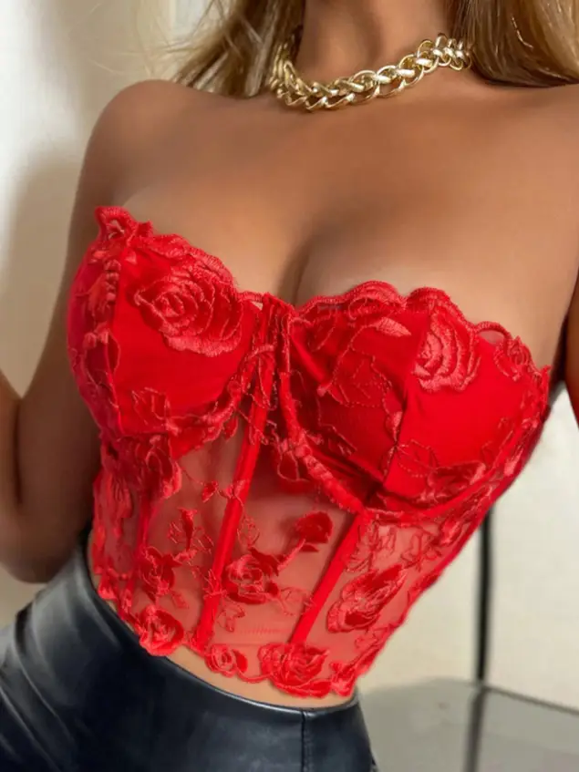 Atrevete a deslumbrar con este bustier de encaje bordado, pensado para realzar tu figura con un toque de pasión y elegancia. Su diseño con transparencias y flores en relieve combina sensualidad y estilo, perfecto para una noche especial o para transformar cualquier look en algo inolvidable.