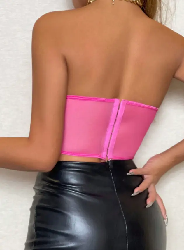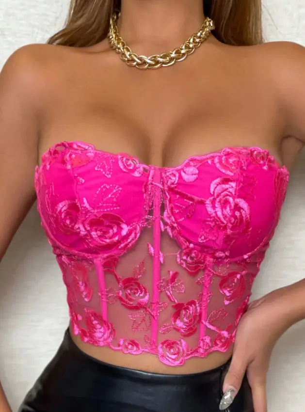 Atraviesa la noche con una pieza que es pura declaración. Este bustier de encaje bordado en un rosa vibrante no solo realza tu figura, sino que enciende la chispa de la pasión y la elegancia. Sus delicadas flores en relieve bailan sobre transparencias estratégicas, fusionando sensualidad y sofisticación para una prenda inolvidable.